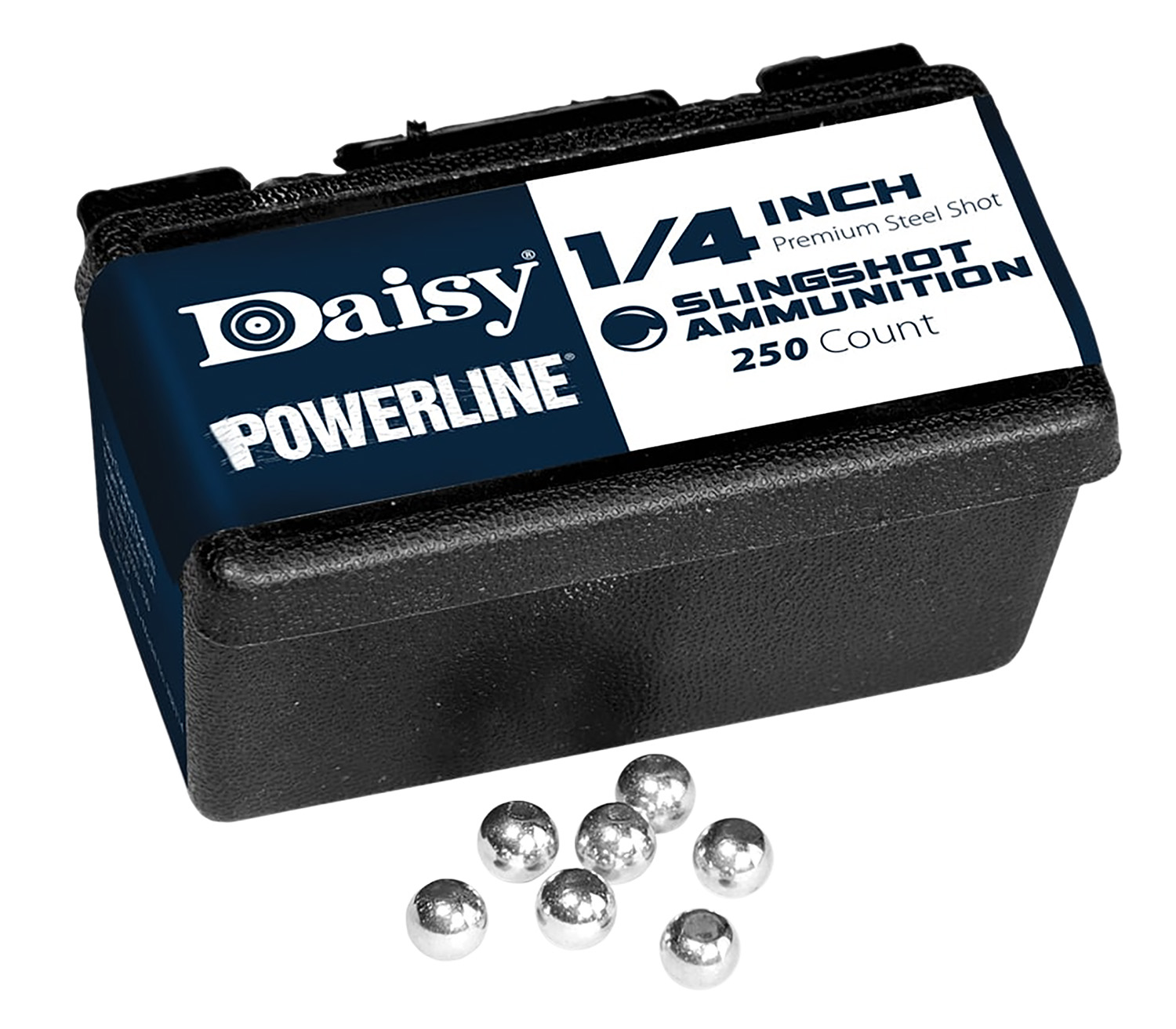 Daisy 1/4″ diameter slingshot ammo in a convenient box with a belt clip.