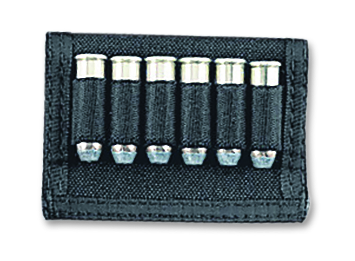 Uncle Mike’s Cartridge Slide is made of a nylon web with sewn-on elastic loops and slides onto your belt. It fits belts up to 2.25″ wide.