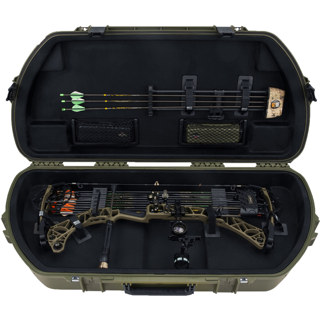 The SKB iSeries Shaped Bow Case features a robust, waterproof construction that meets military specifications, ensuring your equipment remains secure in any environment. The innovative curved bow shape design not only reduces weight for easier transport but also offers a more compact profile, perfect for the archer on the go. This case includes four hook-and-loop tie-downs for a stable fit. Below the bow, there’s ample storage for up to a dozen arrows and additional lid storage for a quiver and two accessory boxes to keep your gear organized.