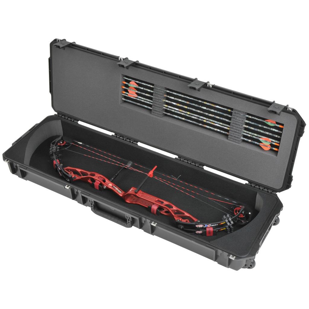 Injection molded case has four SKB patented trigger latches, four reinforced padlock locations, cushioned snap down handles on three sides and recessed, in-line skate style wheels, to ensure that transporting your gear around the world is both worry and trouble free. The interior of the case features a custom foam insert and repositionable tie downs for secure fit and cushioning of your gear and a water jet cut foam arrow system that holds up to a dozen arrows.