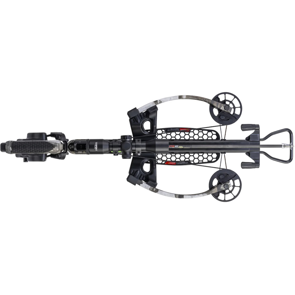The TenPoint Phantom De-Cock is an ultra-compact reverse-draw crossbow built for balanced handling and consistent accuracy. It weighs 7.4 lbs, measures 28.5 inches long, and is 8.4 inches narrow, delivering speeds up to 400 fps. The ACUdraw De-Cock system provides controlled cocking and de-cocking, and the D1 two-stage trigger offers a crisp 3 1/2-pound pull with a dry-fire inhibitor. Package includes a Pro-View 400 lighted scope, three Pro Elite 400 carbon arrows with 0.003-inch straightness, quiver, bow hanger, and a string dampening system.